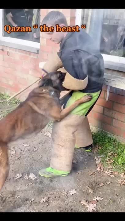 Qazan ist ein sehr zielstrebiger Hund mit einem sehr starken Stoßgebiss. Er hat einen harten Charakter und macht vor nichts Halt. Er trainiert im belgischen Ring.